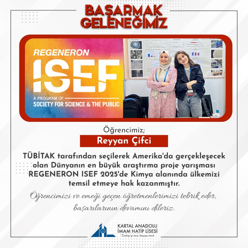 Öğrencimiz Reyyan ÇİFCİ, “Future Smart Biosensor Bandage with Potential Artificial Extracellular Matrix and Bioactive Wound Dressing: A Novel Topical Agent-Assisted Hydrogel Synthesis, Characterization, and Investigation of Action Mechanism” adlı projesiyle TÜBİTAK Türkiye derecesi aldıktan sonra ISEF mülakatından başarı ile geçerek Mayıs ayında Amerika Birleşik Devletleri Ohio eyaletinde gerçekleşecek olan Dünyanın en büyük ve prestijli araştırma proje yarışması ISEF’te (Regeneron International Science and Engineering Fair) ülkemizi temsil etmeye hak kazandı.