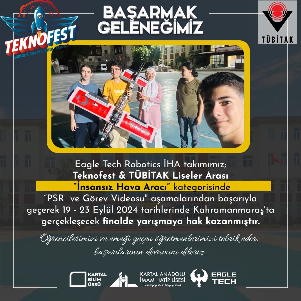 Eagle Tech Robotics İHA takımımız; Teknofest & TÜBİTAK Liseler Arası “İnsansız Hava Aracı” kategorisinde “PSR ve Görev Videosu” aşamalarından başarıyla geçerek 19 – 23 Eylül 2024 tarihlerinde Kahramanmaraş’ta gerçekleşecek finalde yarışmaya hak kazanmıştır. Öğrencilerimizi ve danışman öğretmenimiz Pınar Dündar’ı tebrik eder, başarılarının devamını dileriz.