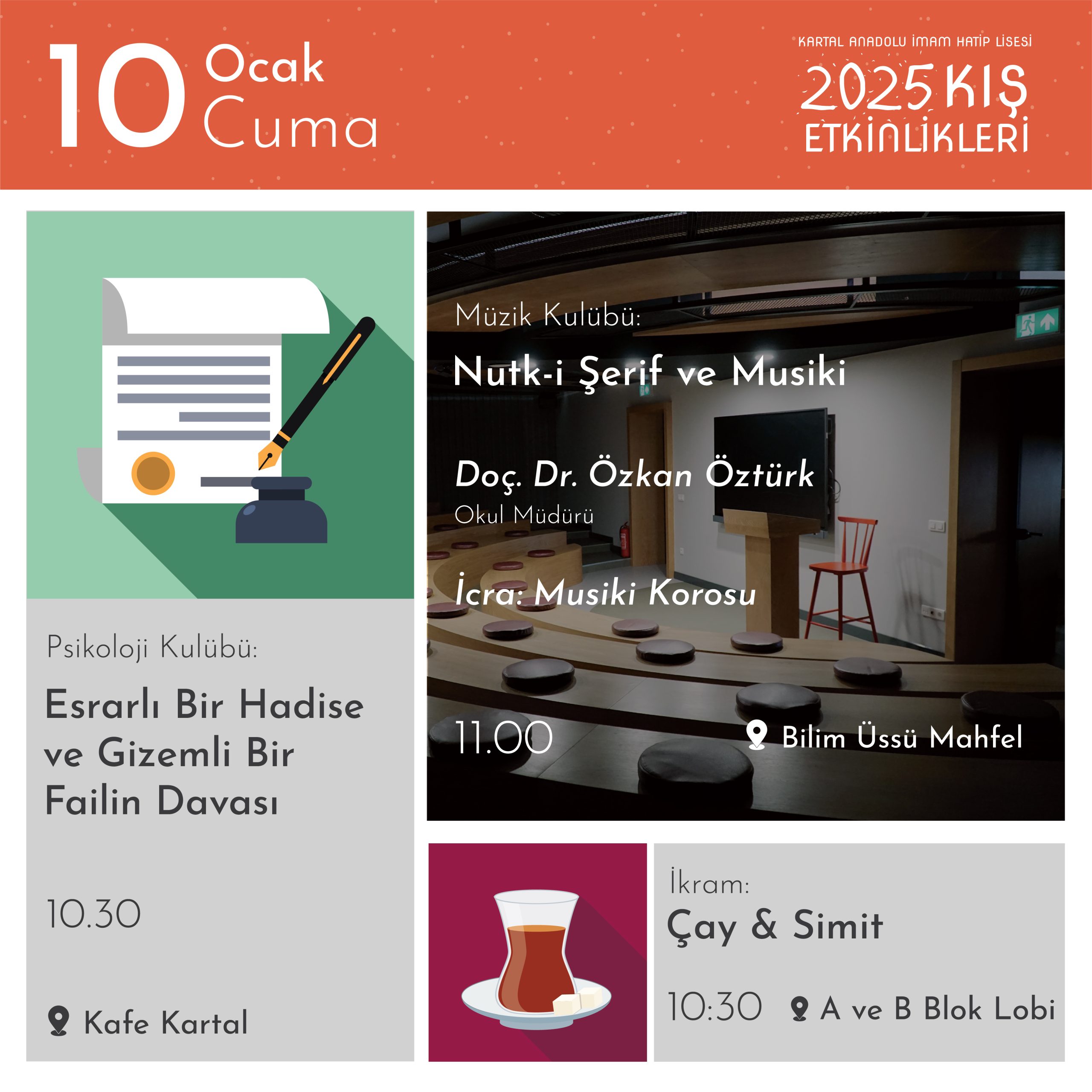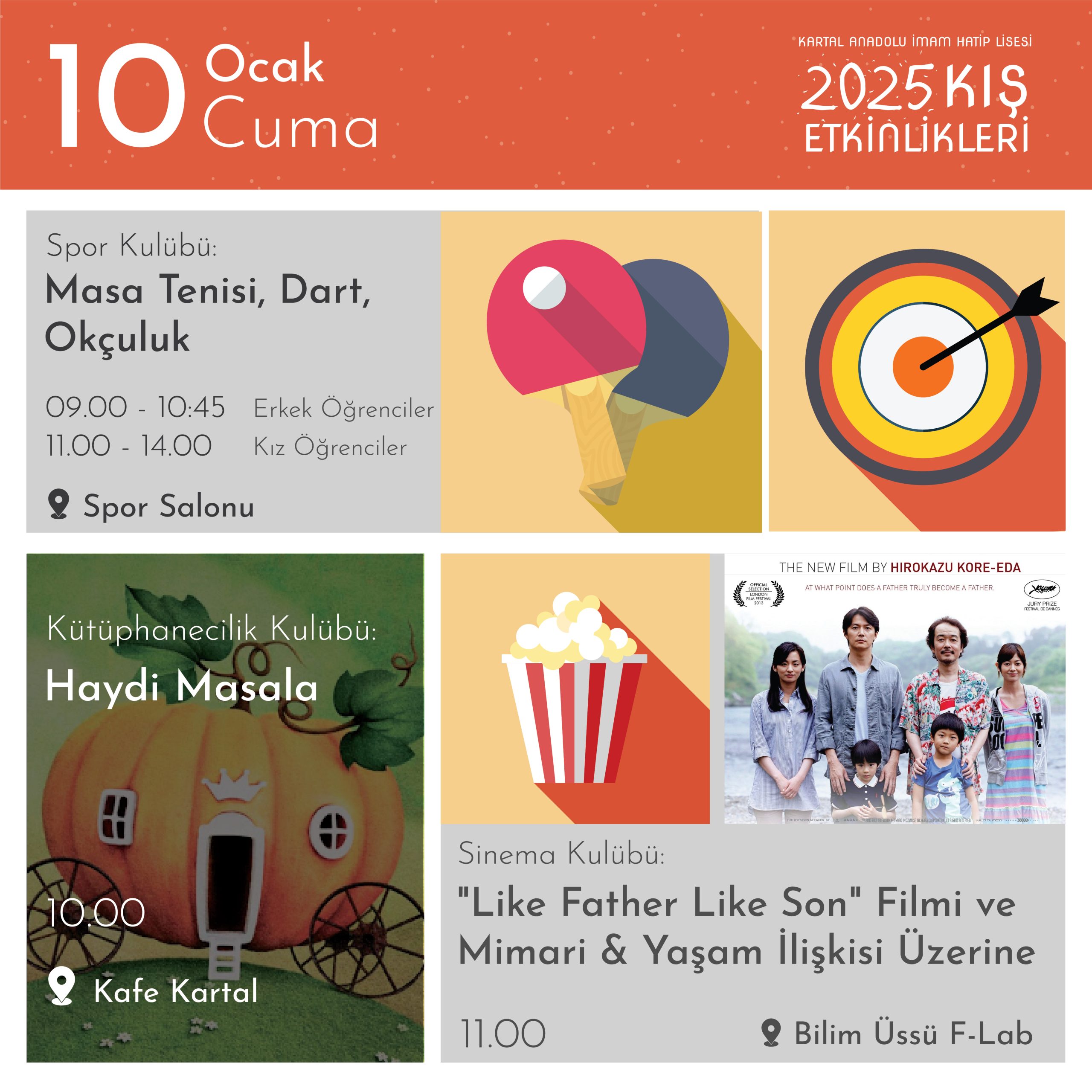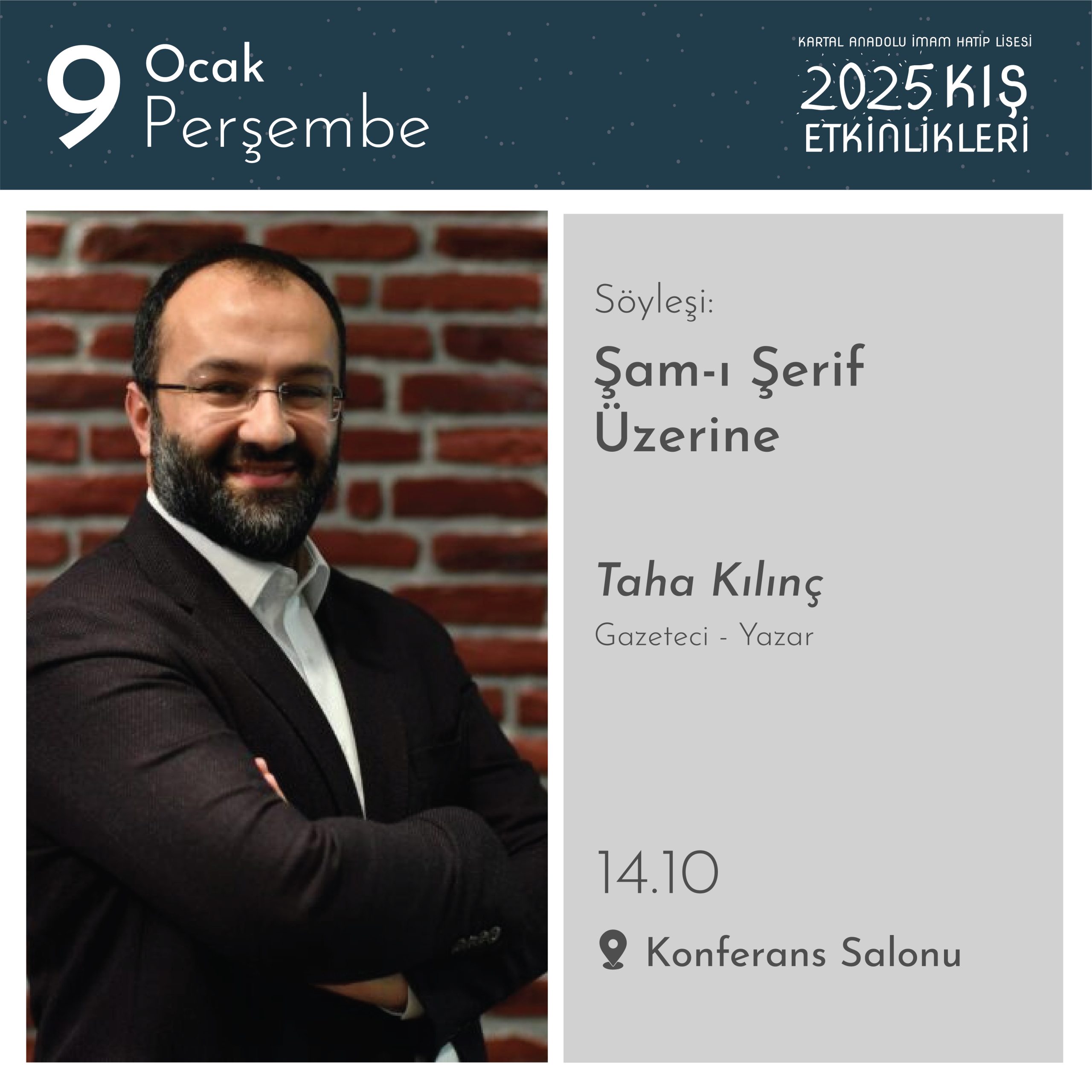 Kartal AİHL’de gelenekselleşen Kış Etkinlikleri”nde; birbirinden farklı isimlerin konuk olduğu söyleşiler, dinletiler, atölyeler, film gösterimleri, yarışmalar, kulüp etkinlikleri, ikramlar ve daha niceleri öğrencilerimizi bekliyor.