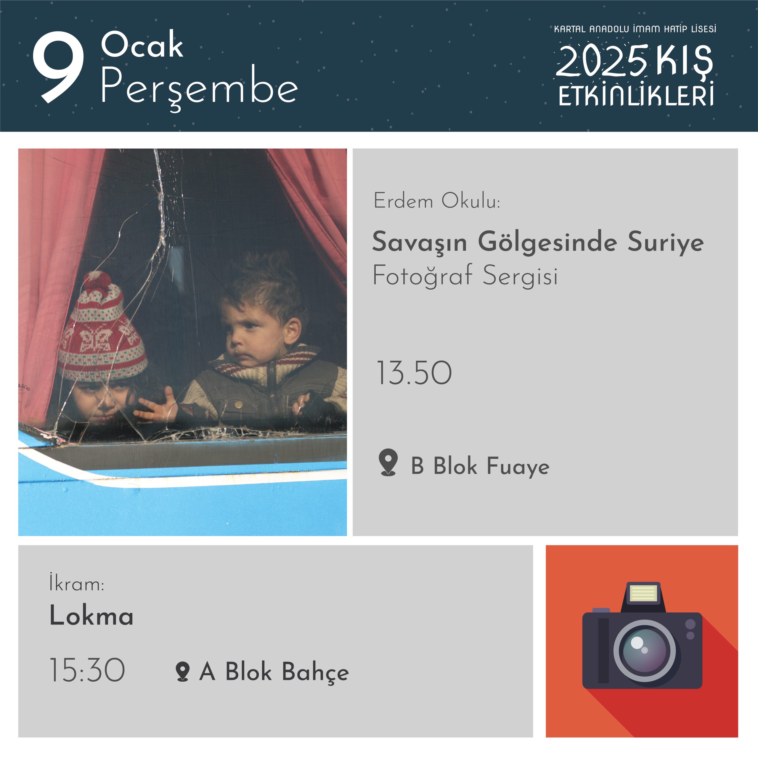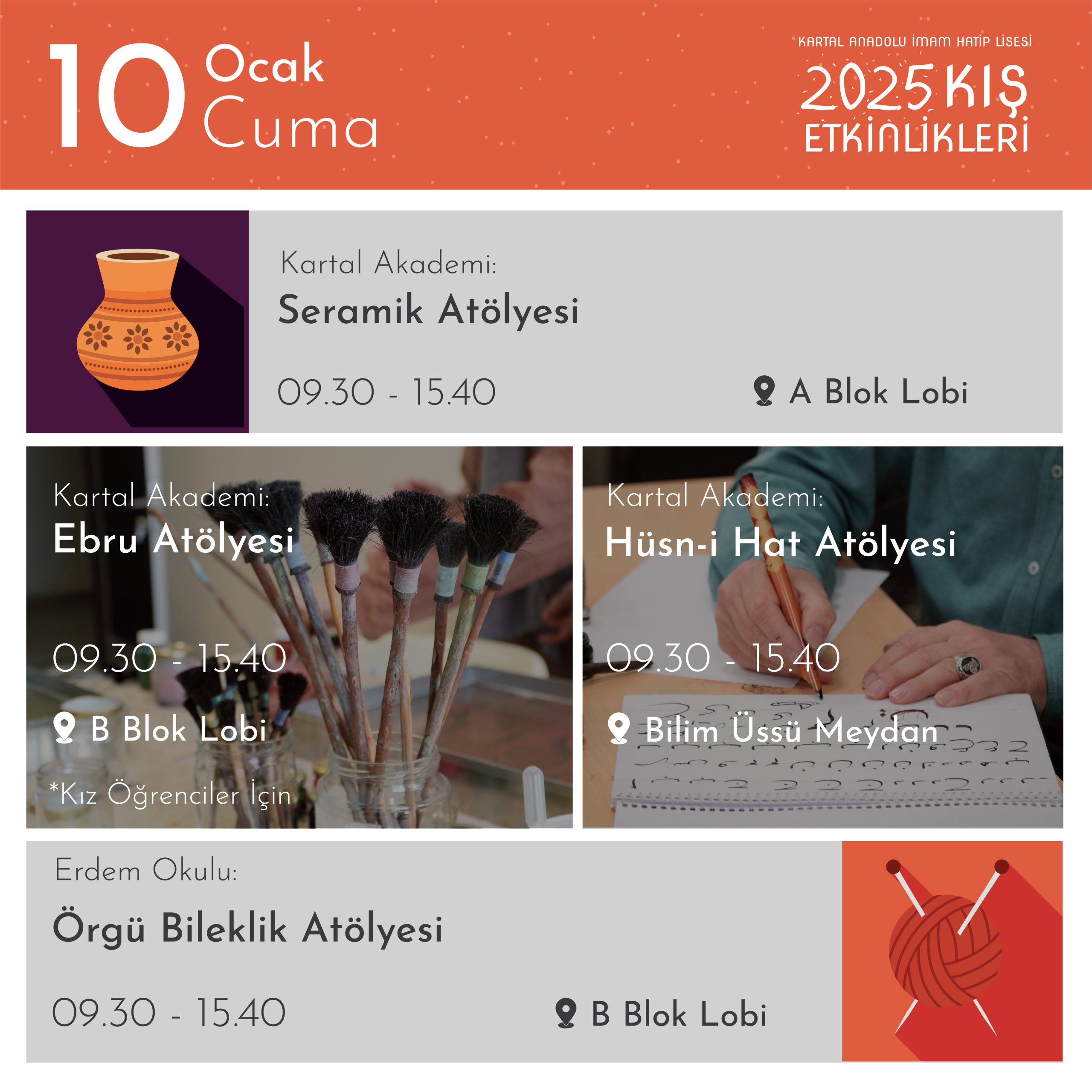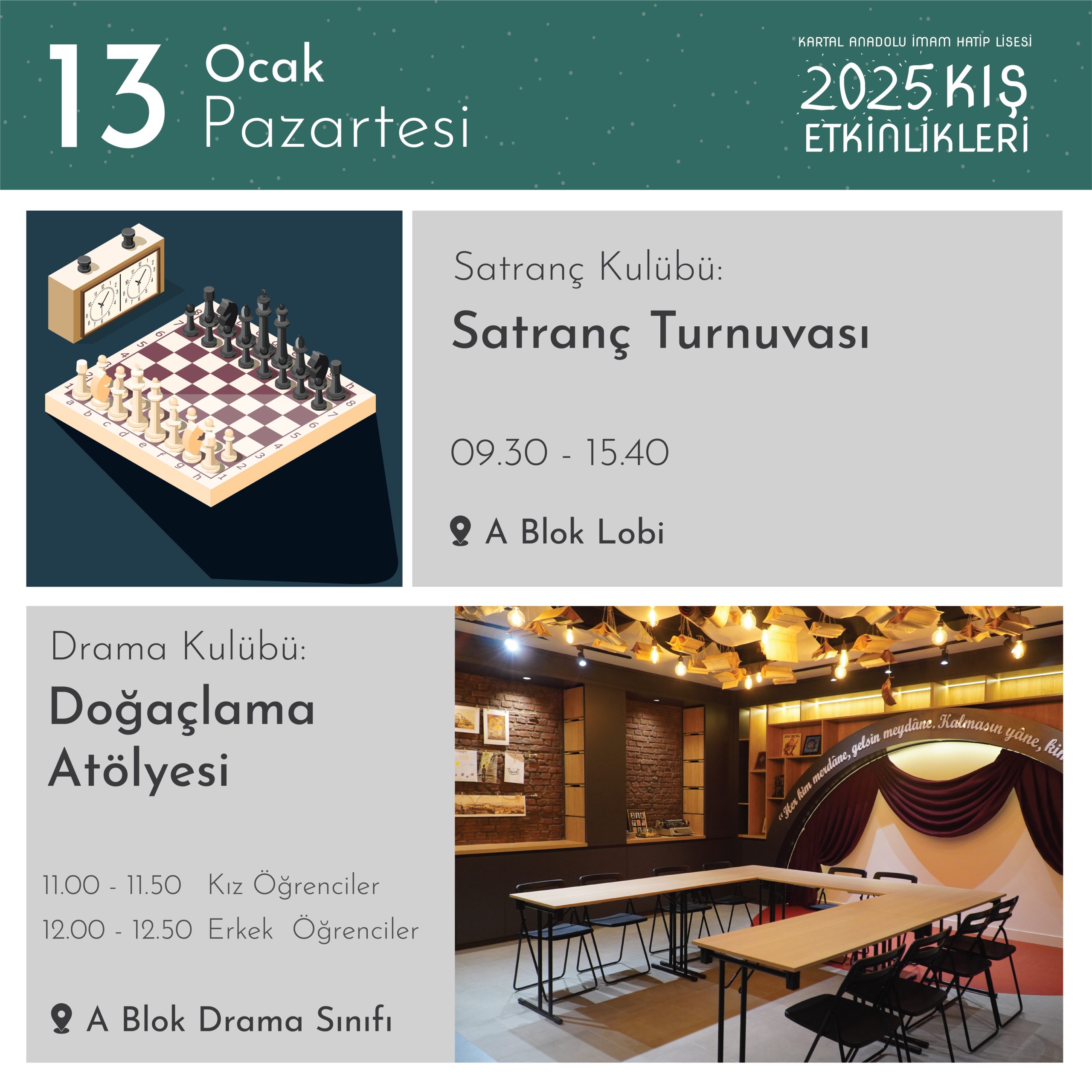 7-16 Ocak 2025 tarihleri arasında Kartal AİHL’nin kulüp çalışmaları ve atölyelerinin bir yansıması olan etkinlikler okulumuzun bütün mekânlarını şenlendirecek…