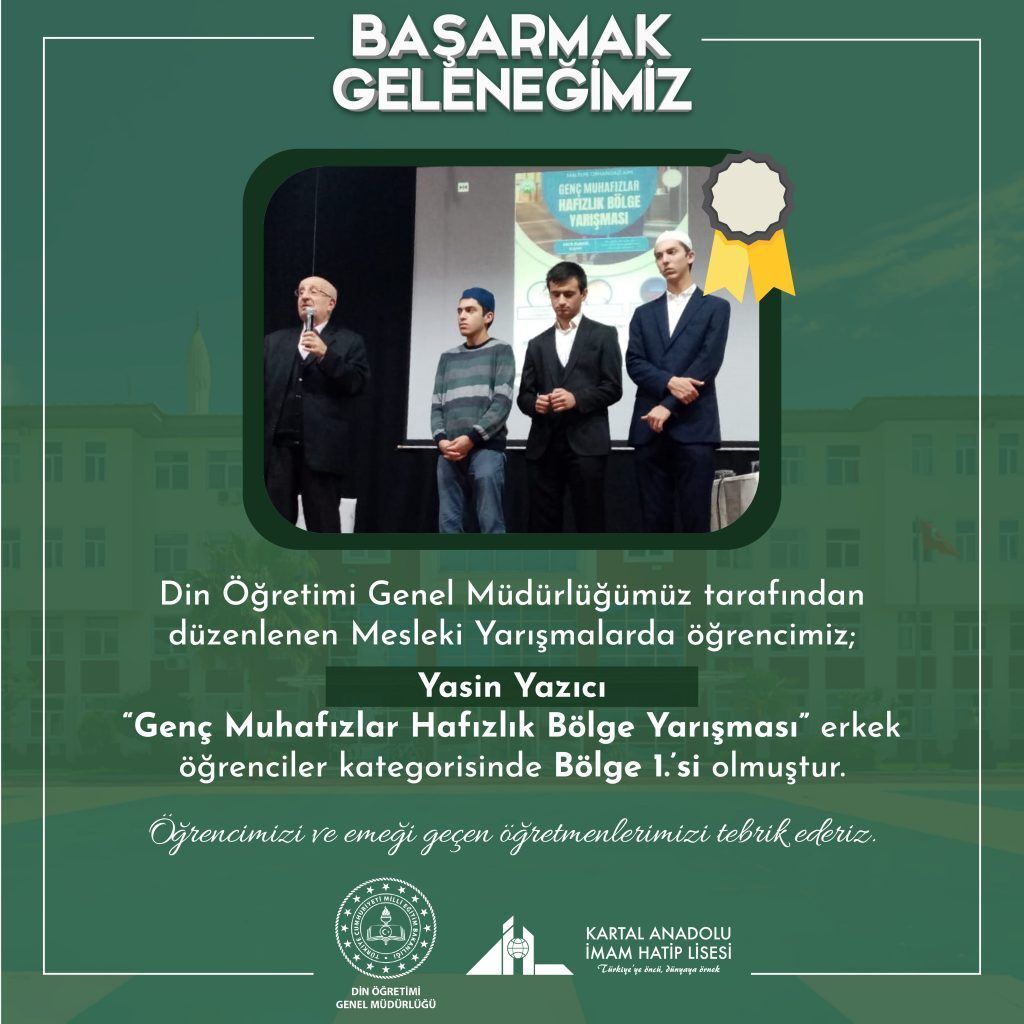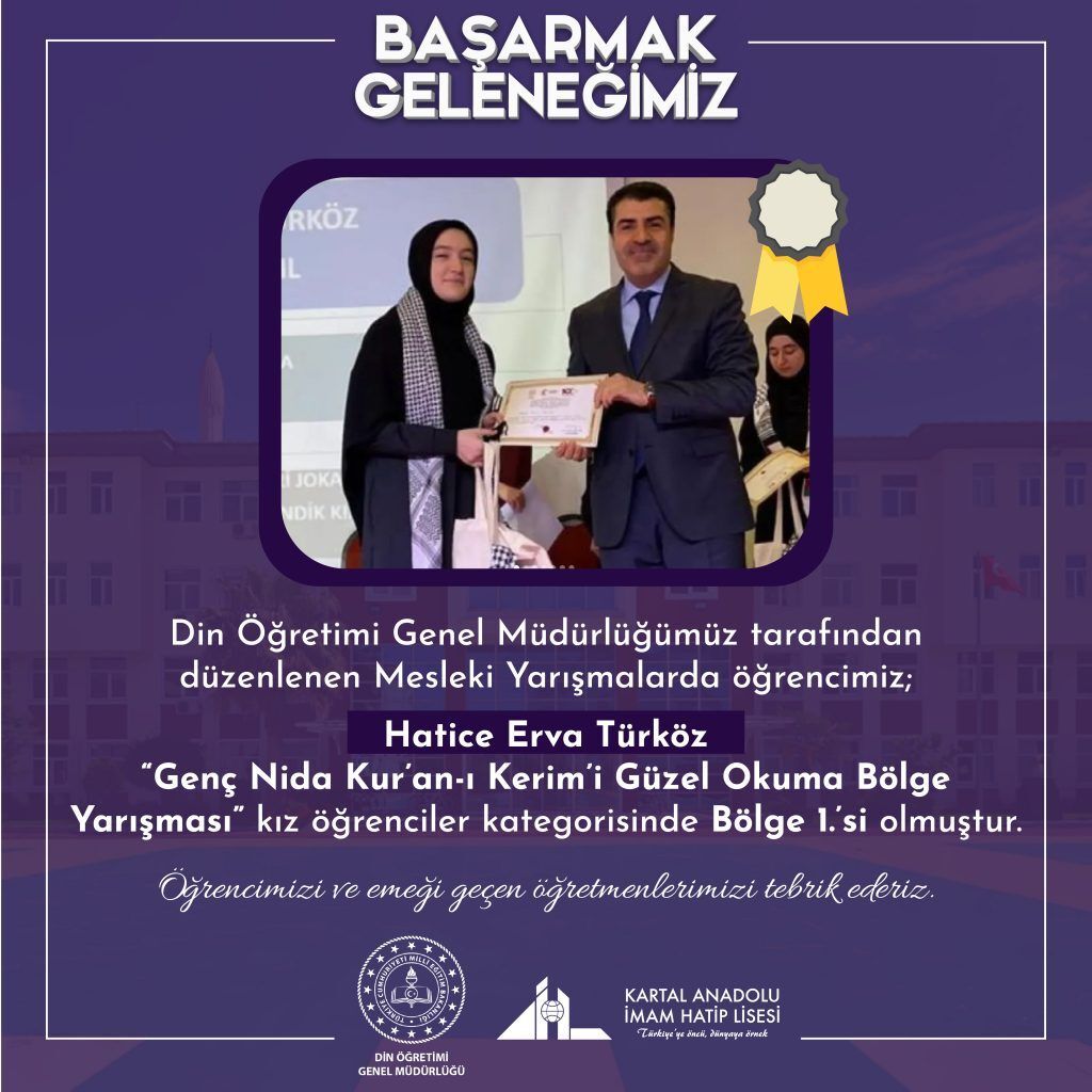 Din Öğretimi Genel Müdürlüğümüz tarafından düzenlenen Mesleki Yarışmalarda öğrencimiz, Hatice Erva Türköz “Genç Nida Kur’an-ı Kerim’i Güzel Okuma Bölge Yarışması” kız öğrenciler kategorisinde Bölge 1.’si olurken, öğrencimiz Yasin Yazıcı ise “Genç Muhafızlar Hafızlık Bölge Yarışması” erkek öğrenciler kategorisinde Bölge 1.’si olmuştur.