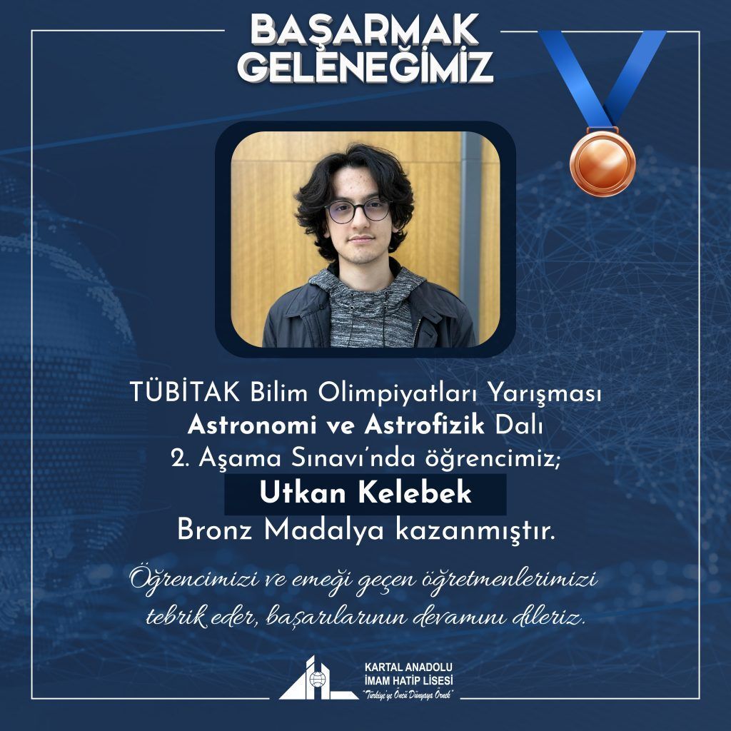 TÜBİTAK Bilim Olimpiyatları Yarışması Astronomi ve Astrofizik Dalı 2. Aşama Sınavı’nda öğrencilerimiz; Aziz Samet Zorlu Gümüş Madalya, Utkan Kelebek ise Bronz Madalya kazanmıştır. Öğrencilerimizi ve emeği geçen öğretmenlerimizi tebrik eder, başarılarının devamını dileriz.